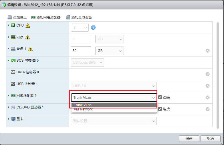 接下来,配置虚拟机网卡,使其使用该 Trunk 网络